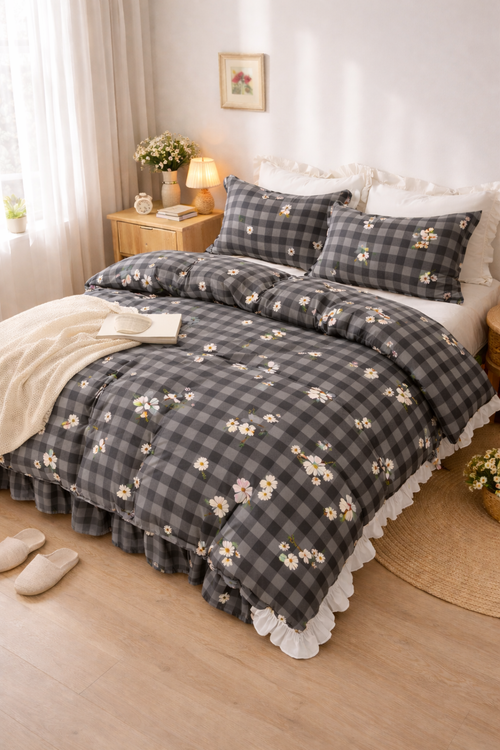 روتختی یک رو چاپی پینترستی چین دار (جنس نخ میکروتنسل) طرح چهارخونه طوسی گلدار