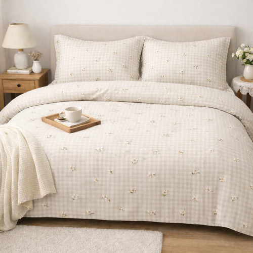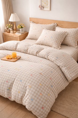 روتختی یک رو چاپی پینترستی (جنس نخ میکروتنسل) طرح چهارخونه گلدار کرم
