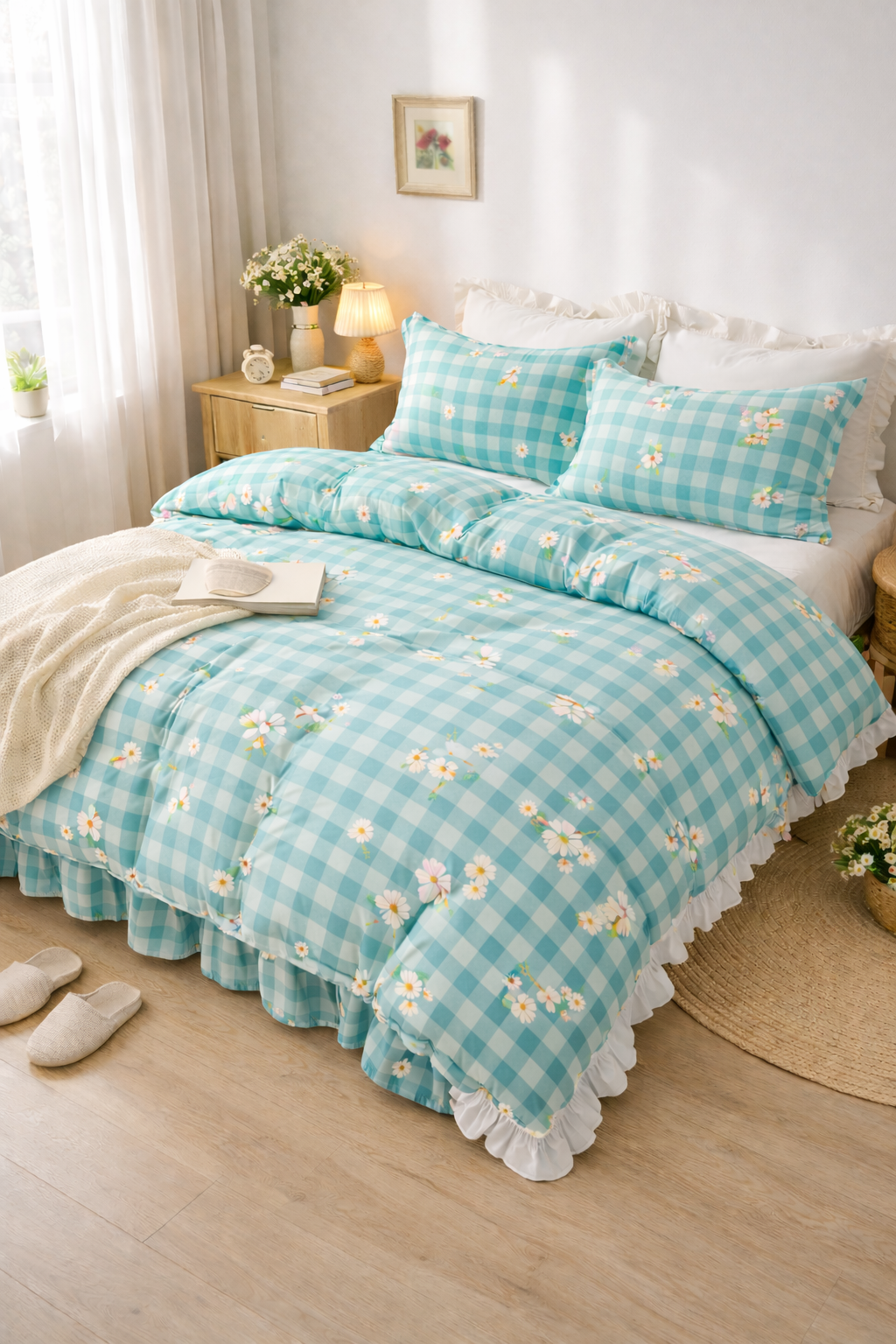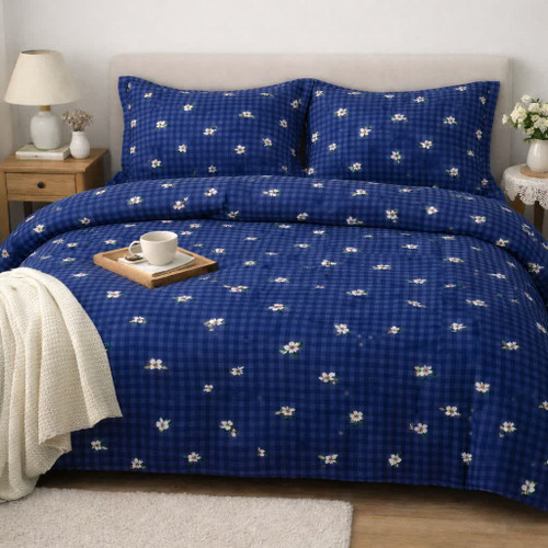 روتختی یک رو چاپی پینترستی (جنس نخ میکروتنسل) طرح چهارخونه گلدار آبی پررنگ